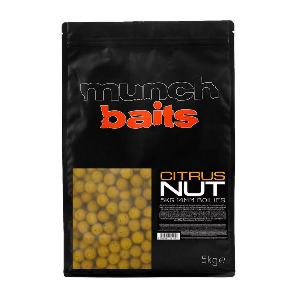Citrus Nut Boilies from Munch Baits offer a sweet and tangy aroma, with a unique blend of nut and citrus flavors. Perfect for carp fishing.
